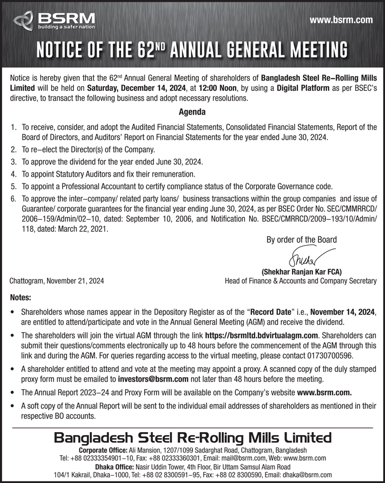 Notice of the 62nd AGM of Bangladesh Steel Re-Rolling Mills Limited