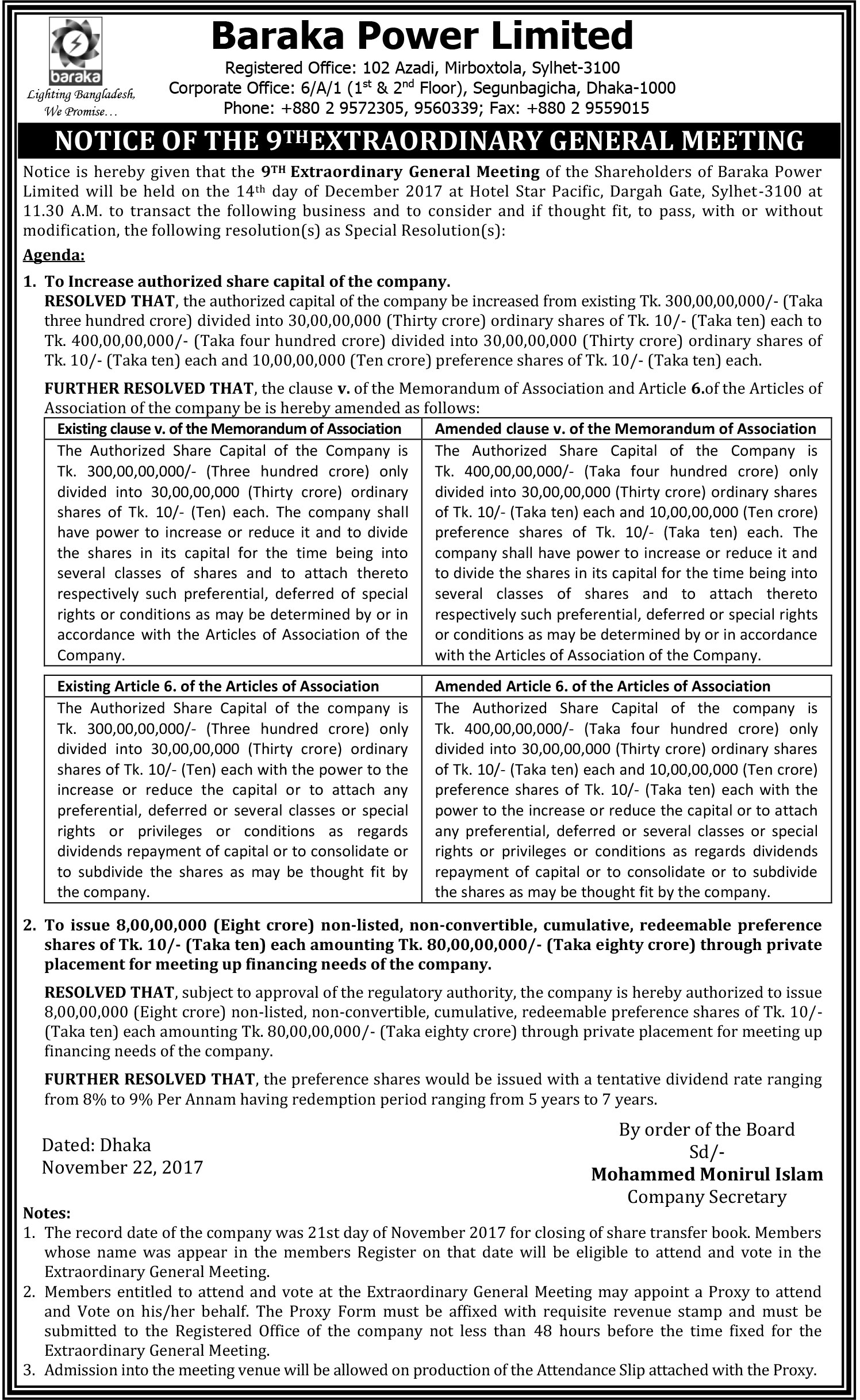 Notice of the 9th Extraordinary General Meeting of Baraka Power Limited