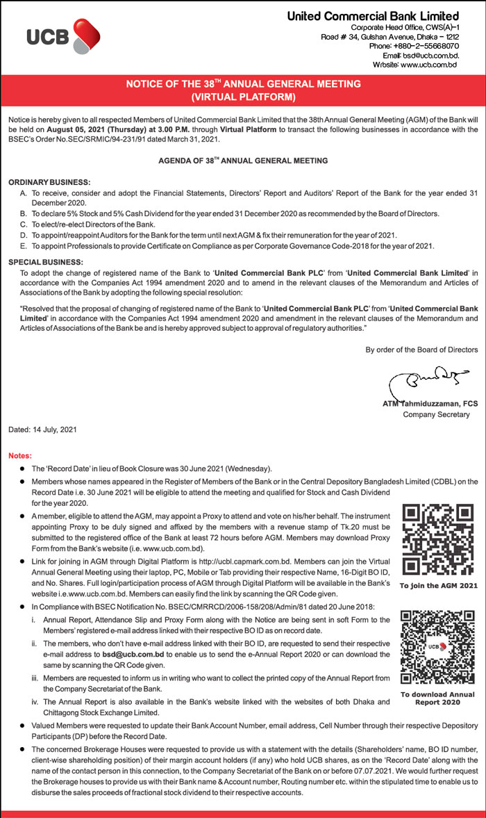 Notice of the the 38th AGM of United Commercial Bank
