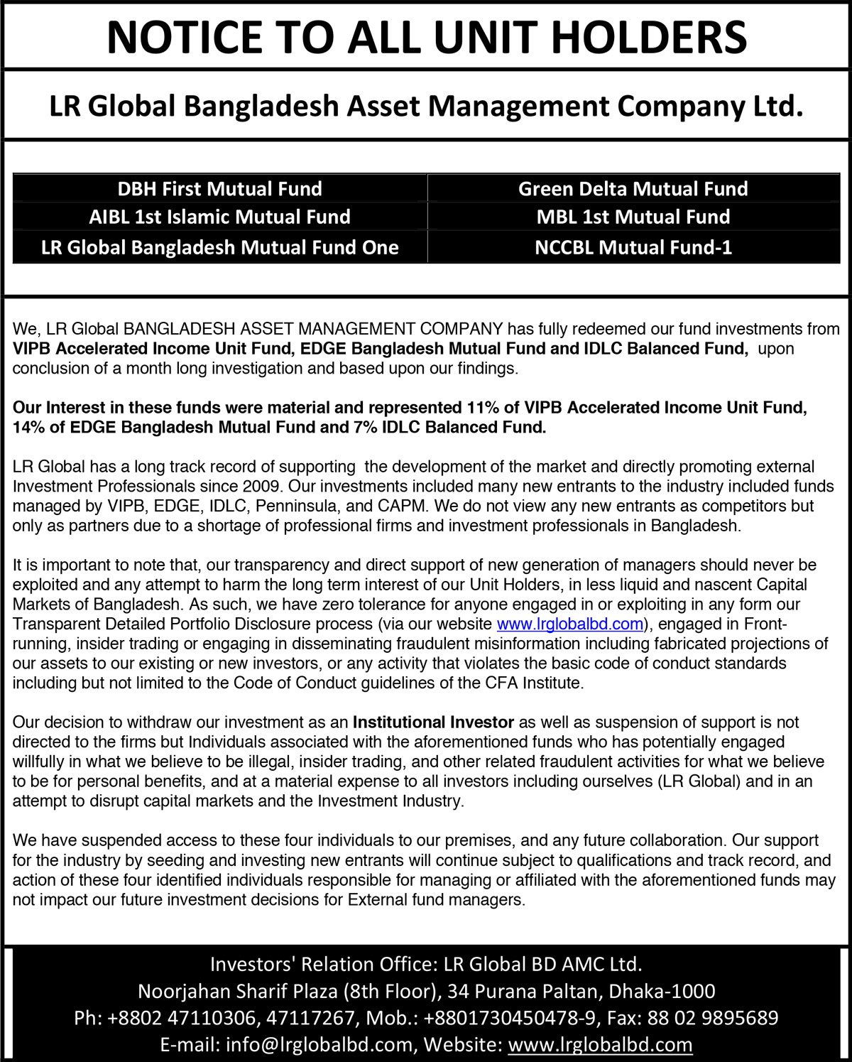 Notice to All Unit Holders of LR Global Bangladesh Asset Management Company Ltd.