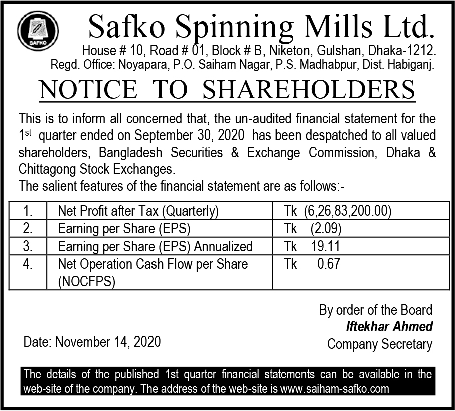 Notice To Shareholder of Safko Spinnings Mills Ltd.