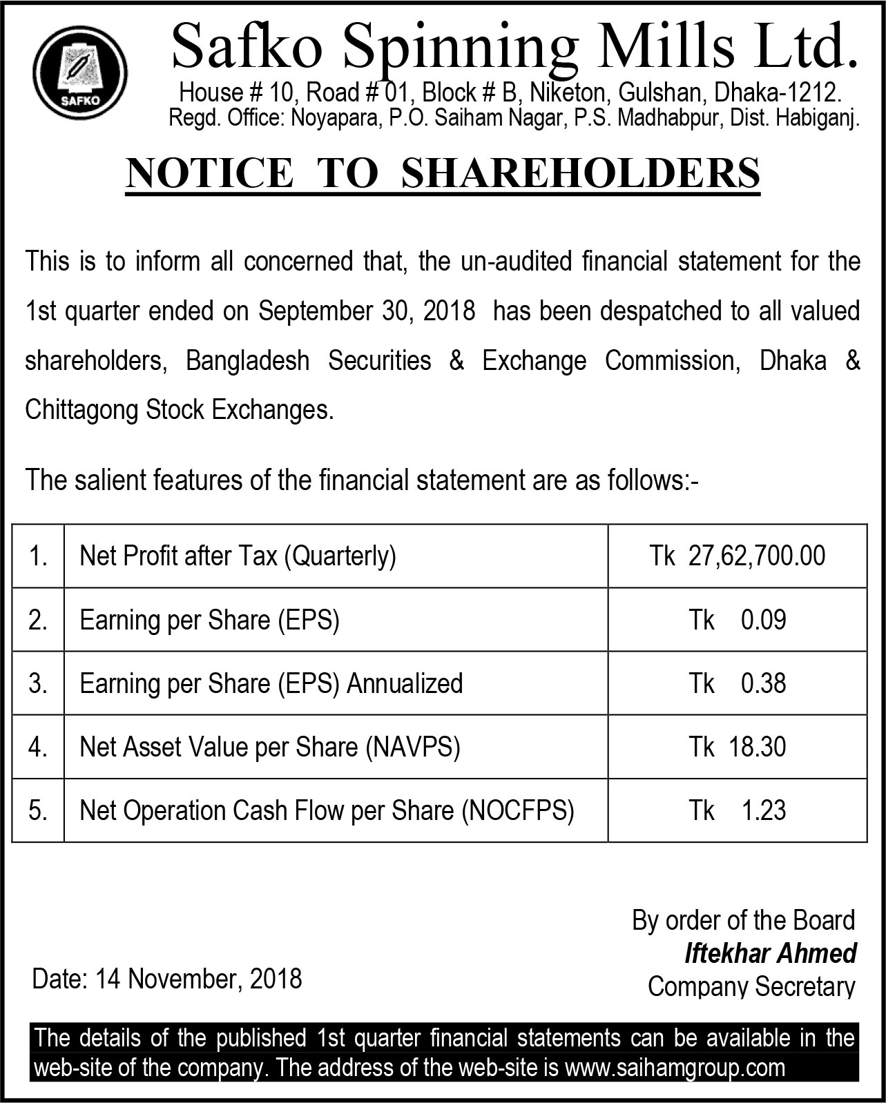 Notice to Shareholders of Safko Spinnings Mills Ltd.