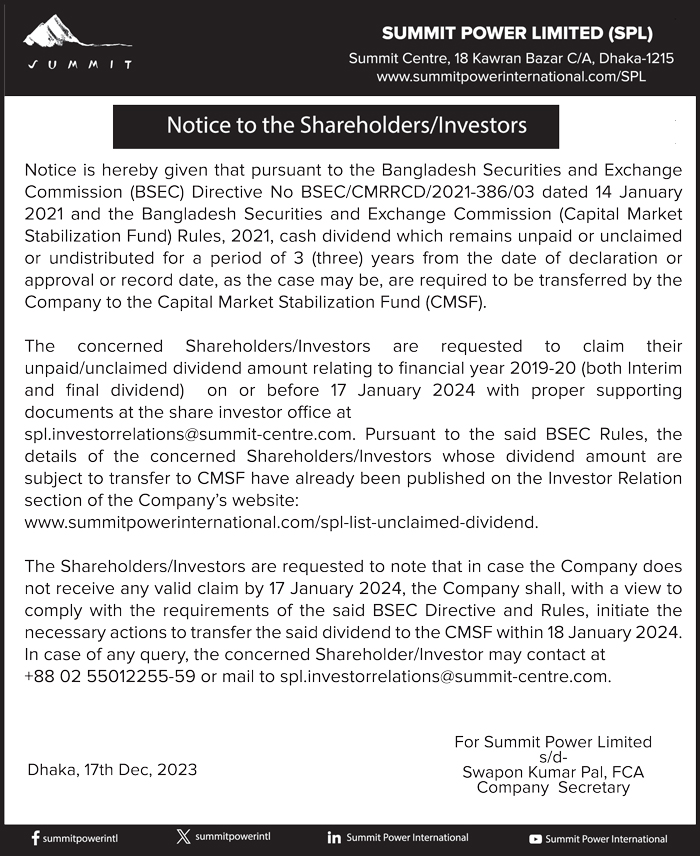Notice to the Shareholder/Investors of Summit Power Limited