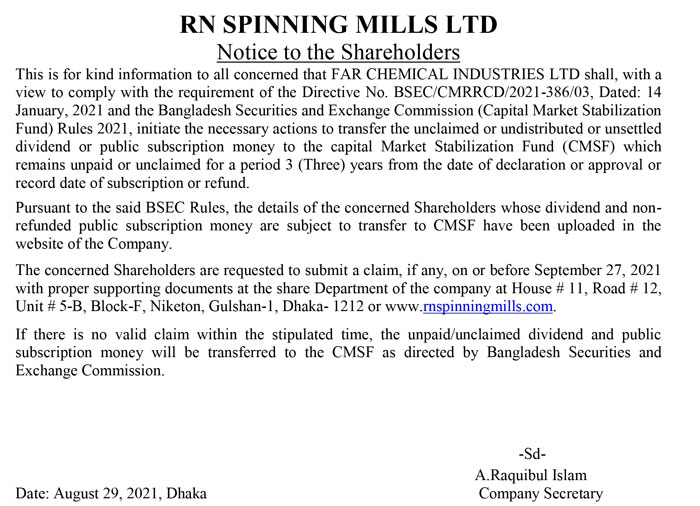 Notice to the Shareholder of R.N. Spinning Mills Limited