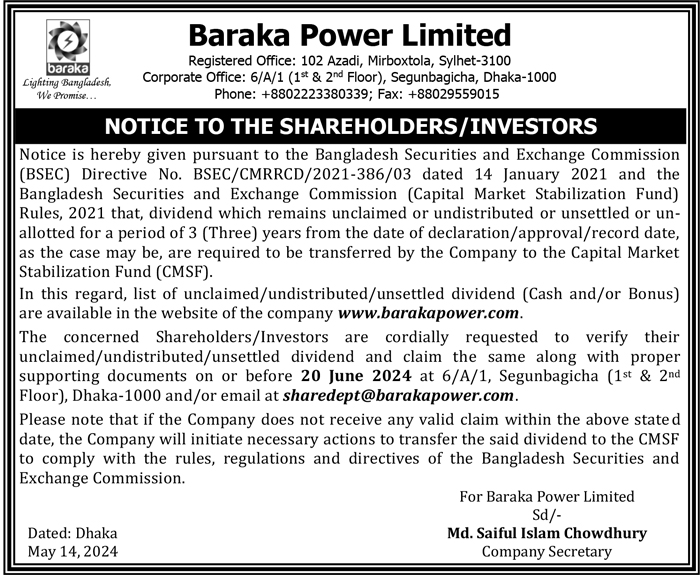 Notice to the Shareholders/Investors of Baraka Power Limited