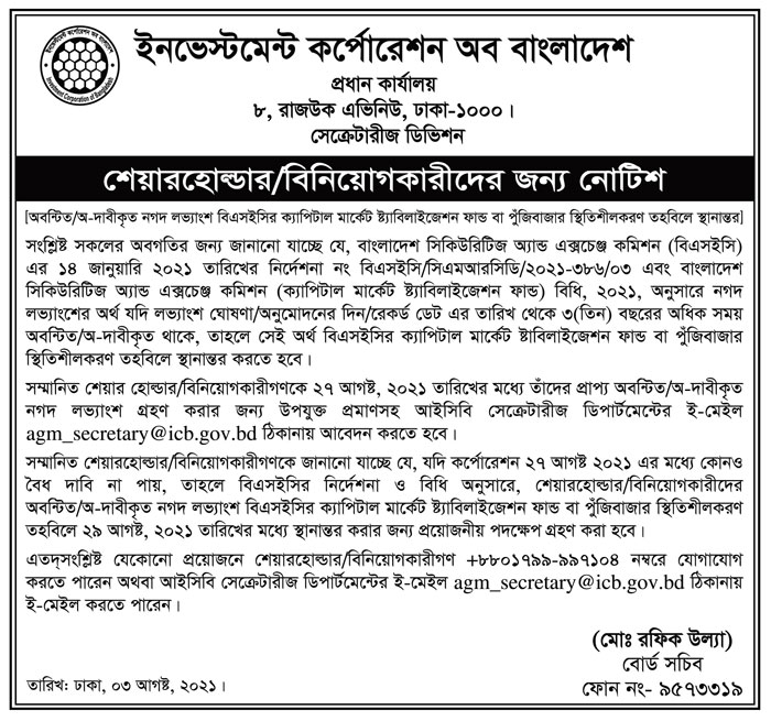 Notice to the Shareholders/Investors of Investment Corporation of Bangladesh
