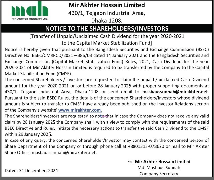 Notice to the Shareholders/Investors of Mir Akhter Hossain Ltd.