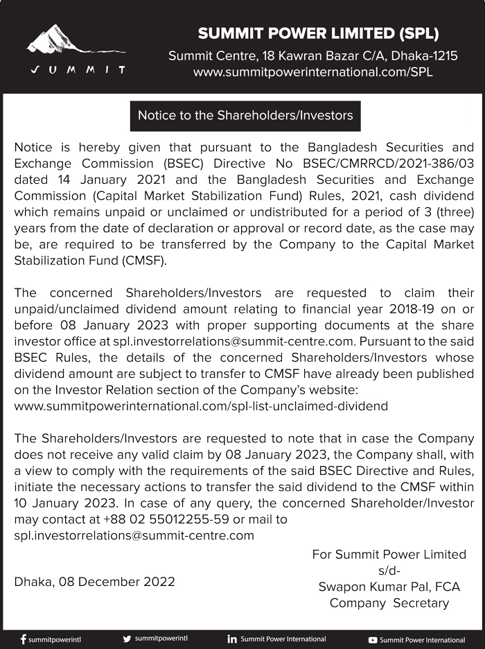 Notice to the Shareholder/Investors of Summit Power Limited