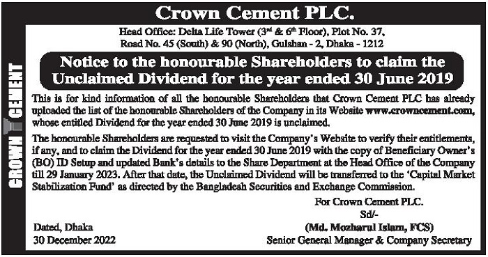 Notic to the Shareholders to claim the Uclaimed Dividend of Crown Cement PLC