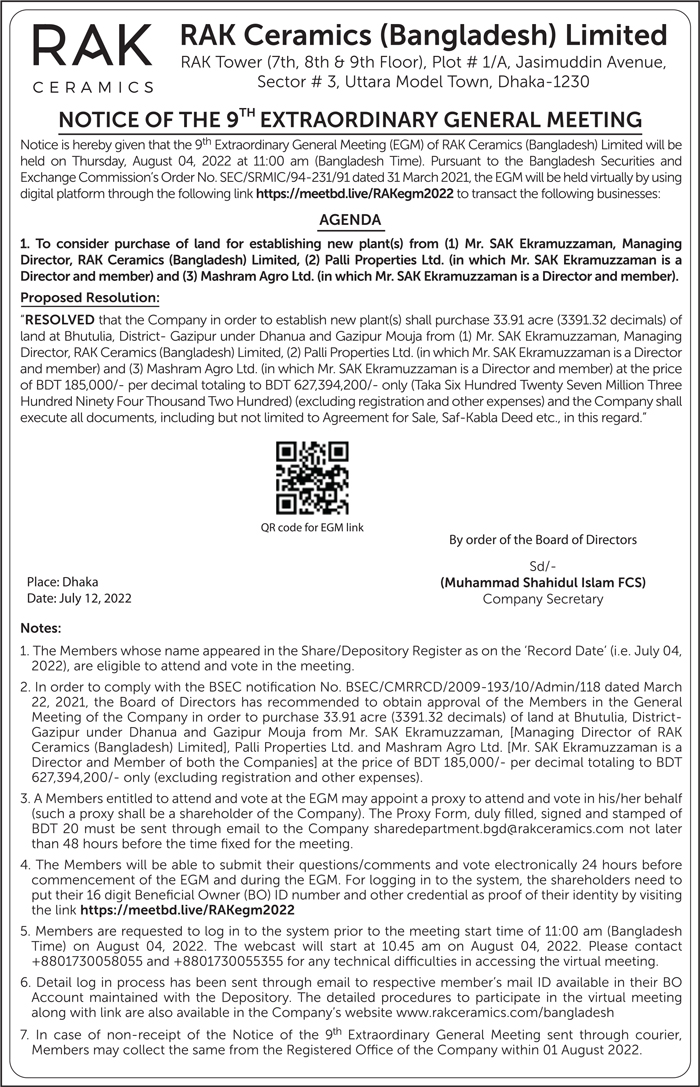 Notie of the 9th EGM of RAK Ceramics (Bangladesh) Limited