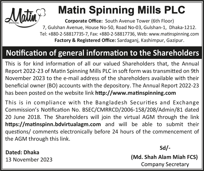 Notice of the 23rd AGM of Matin Spinning Mills PLC