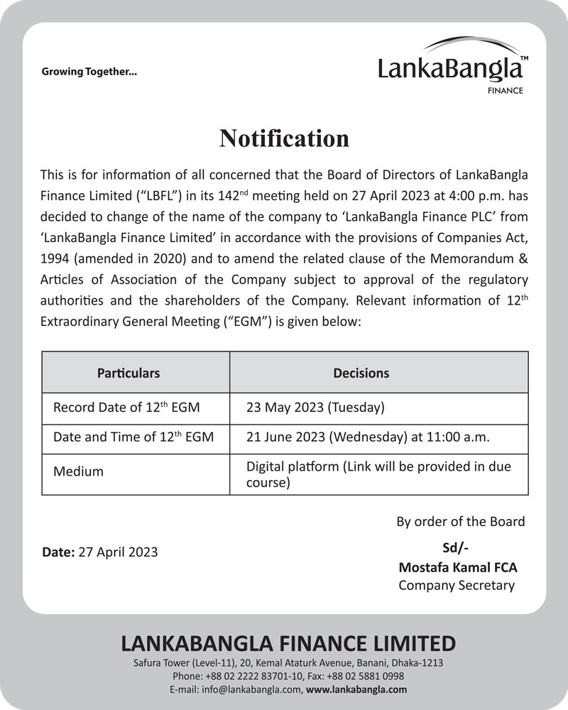 Notification of LankaBangla Finance Limited