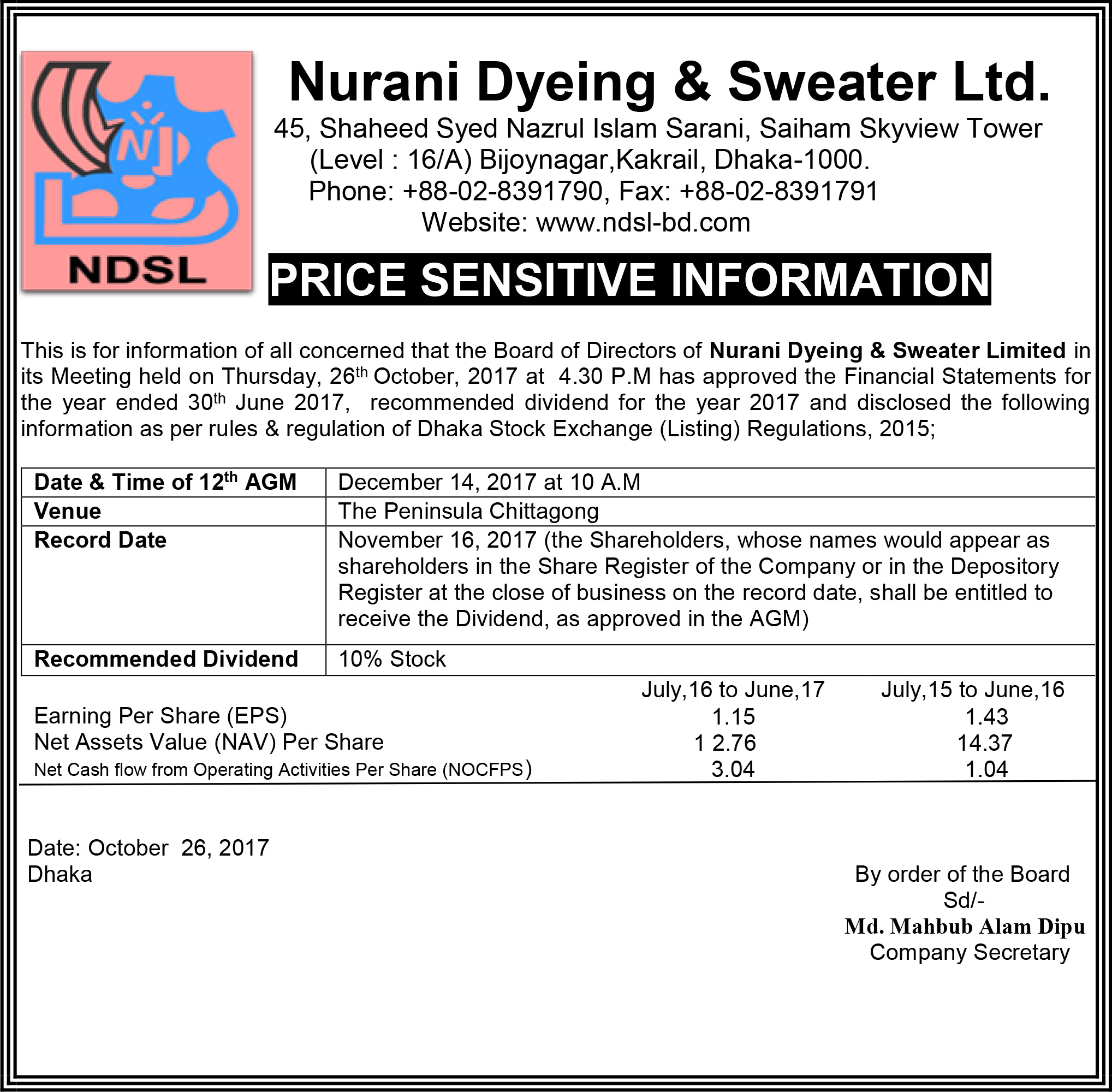 Price Sensitive Information of Nurani Dyeing &Sweater Ltd.