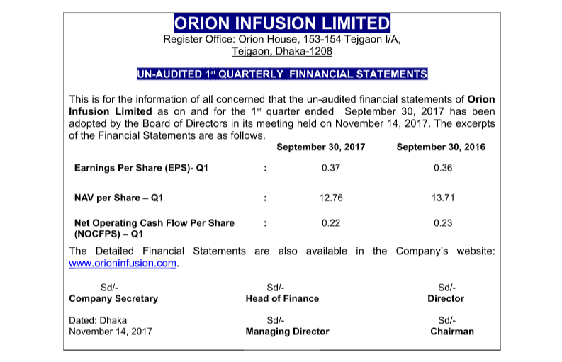 Un-audited Half Yearly (Q2) Financial Statements of Orion Infusion Ltd