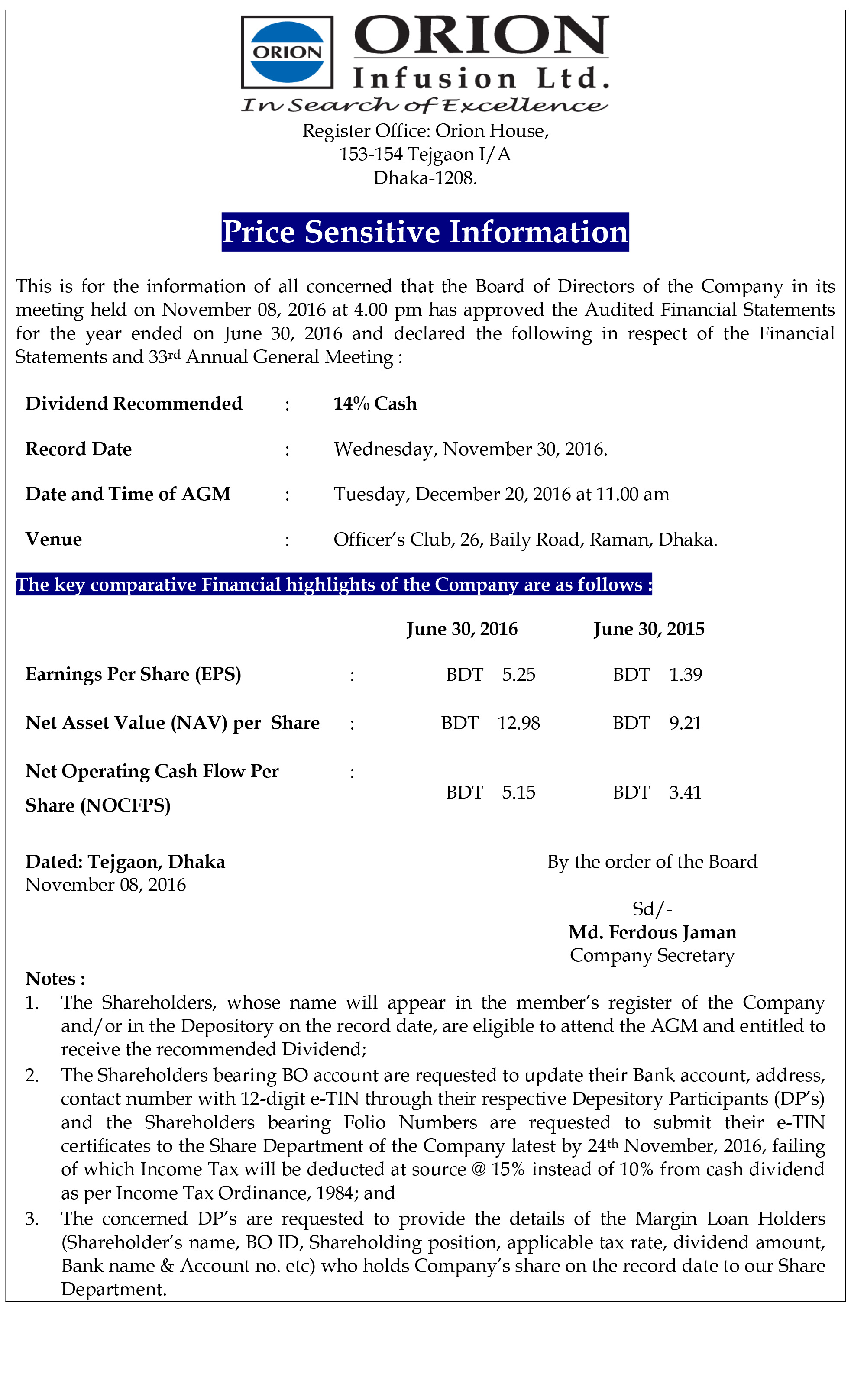 Price Sensitive Information (Q1) of Orion Infusion Ltd