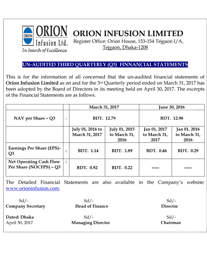 Q3 Un-audited Financial Statements of Orion Infusion Ltd