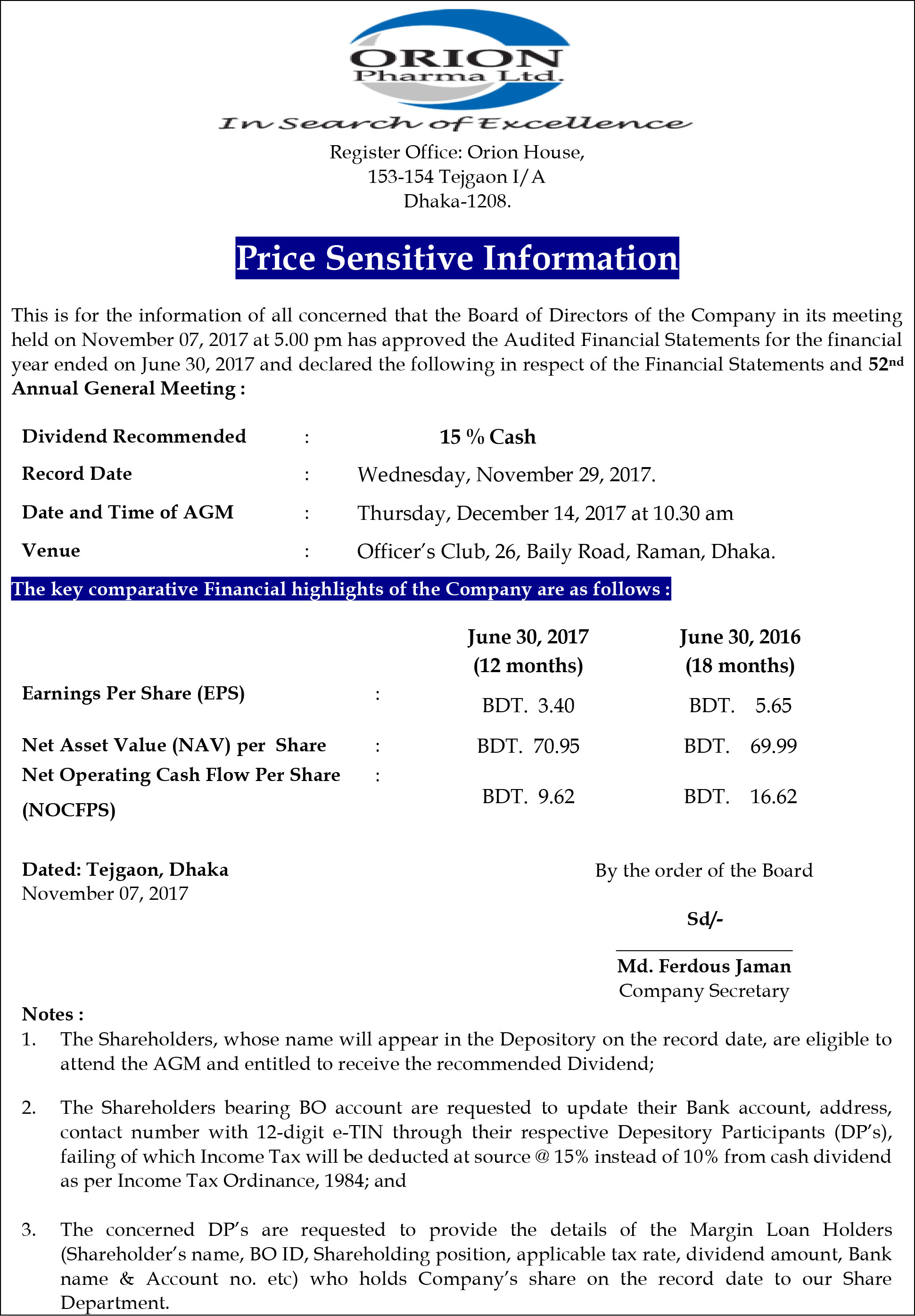 Price Sensitive Information (Q1) of Orion Pharma Ltd