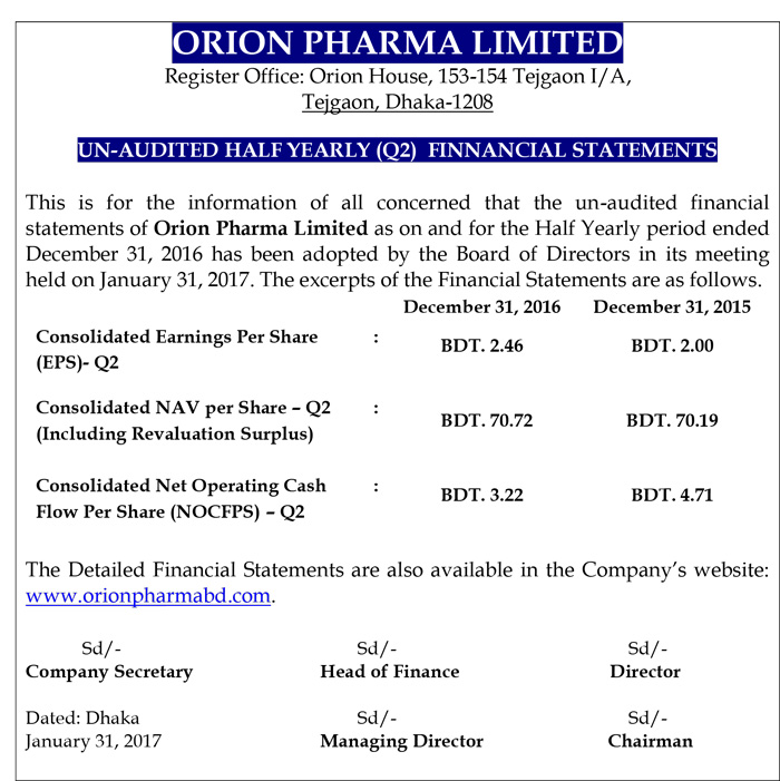 Un-audited Half Yearly (Q2) Financial Statements of Orion Pharma Ltd