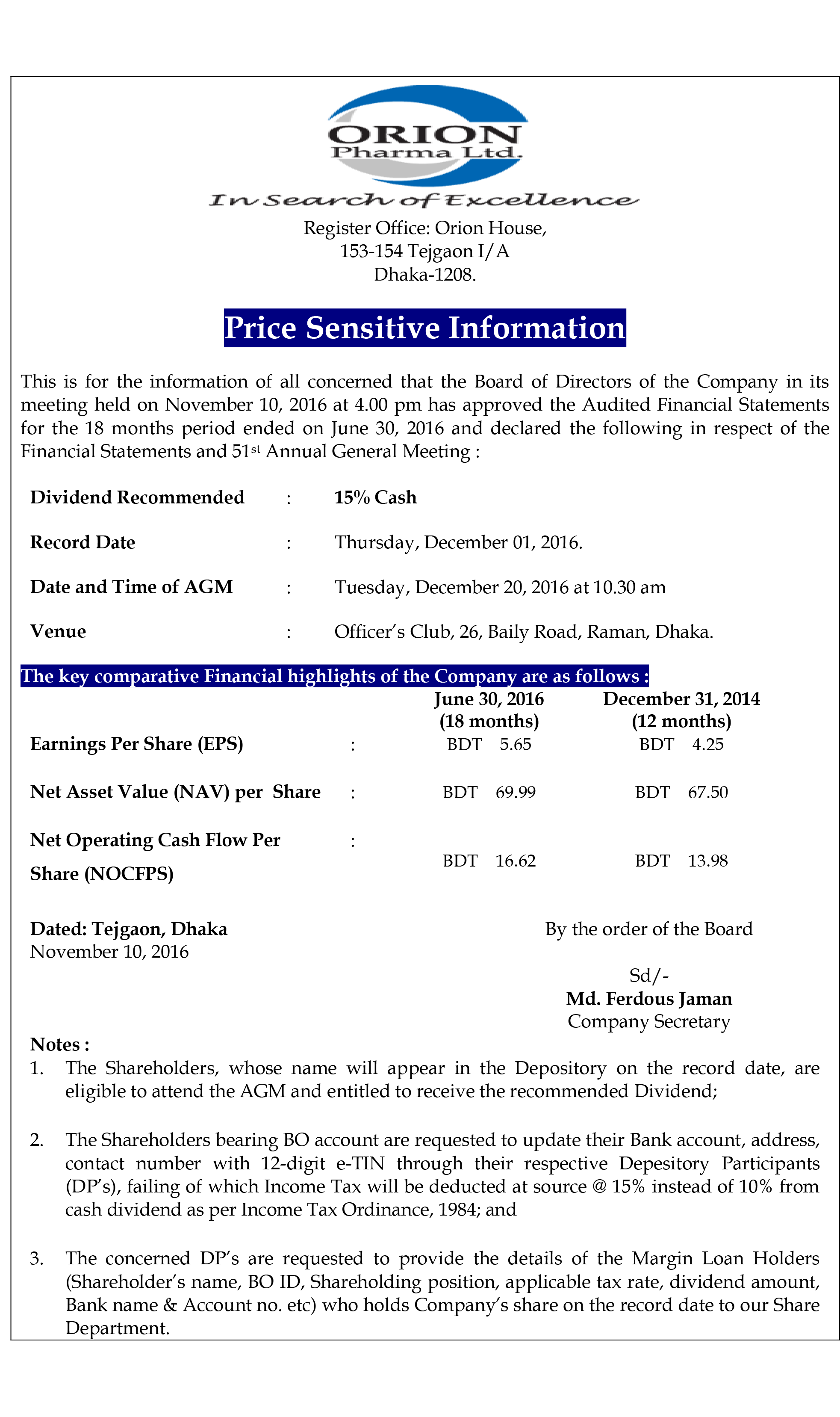 Orion Pharma Ltd Dividend Declare 2016