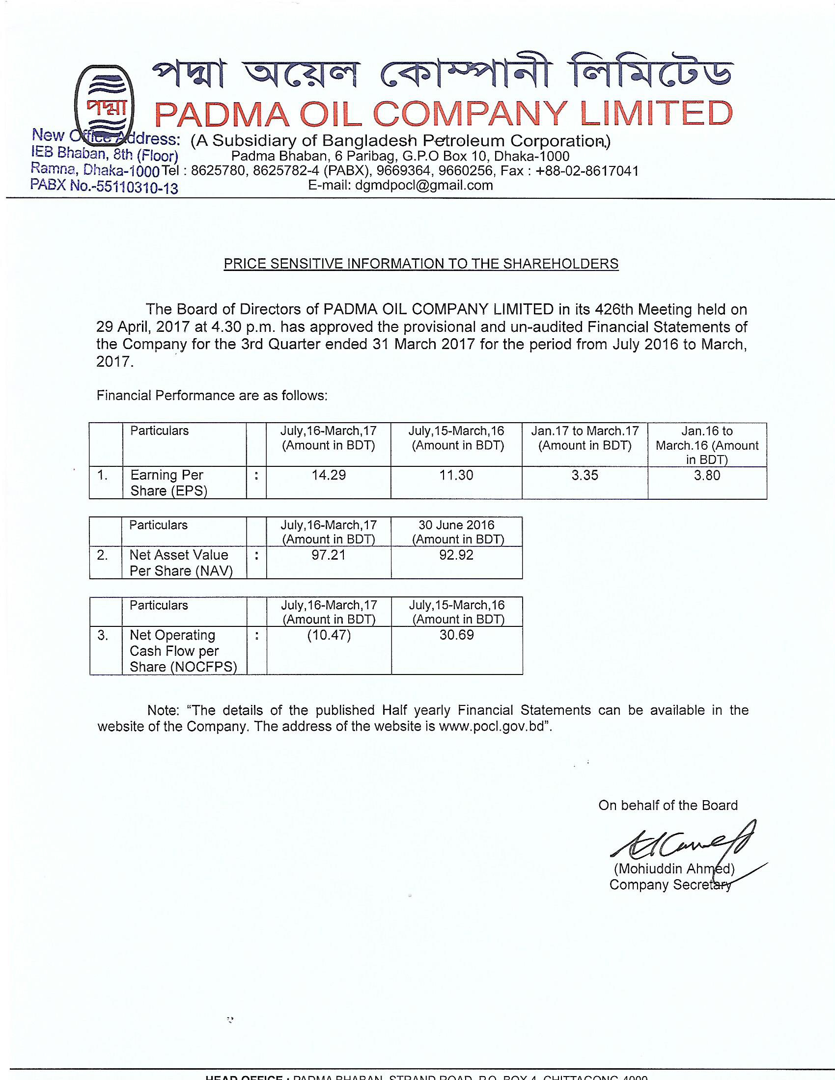 Statement of Financial Position (Provisional & Un-audited) of Padma Oil Company Ltd.