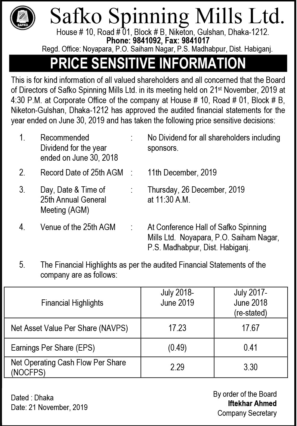 Price Sensitive Information of SAFKO Spinning Mills Ltd