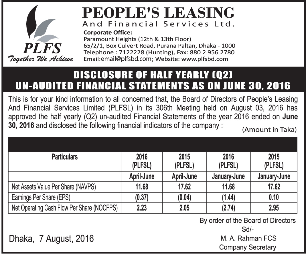 Disclosure of Un-audited Q2 Financial Statements of Peoples Leasing and Financial Services Ltd