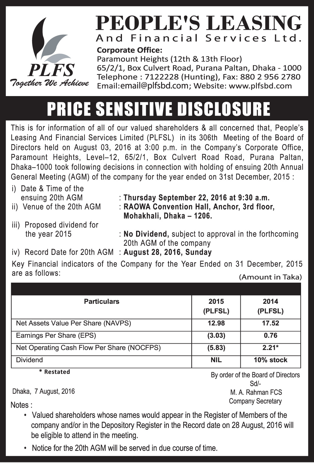 Price Sensitive information Disclosure of Peoples Leasing and Financial Services Ltd