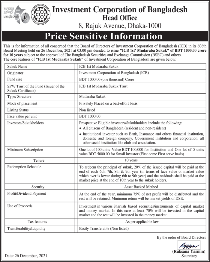 Price Sensitive Information of Investment Corporation of Bangladesh (ICB)