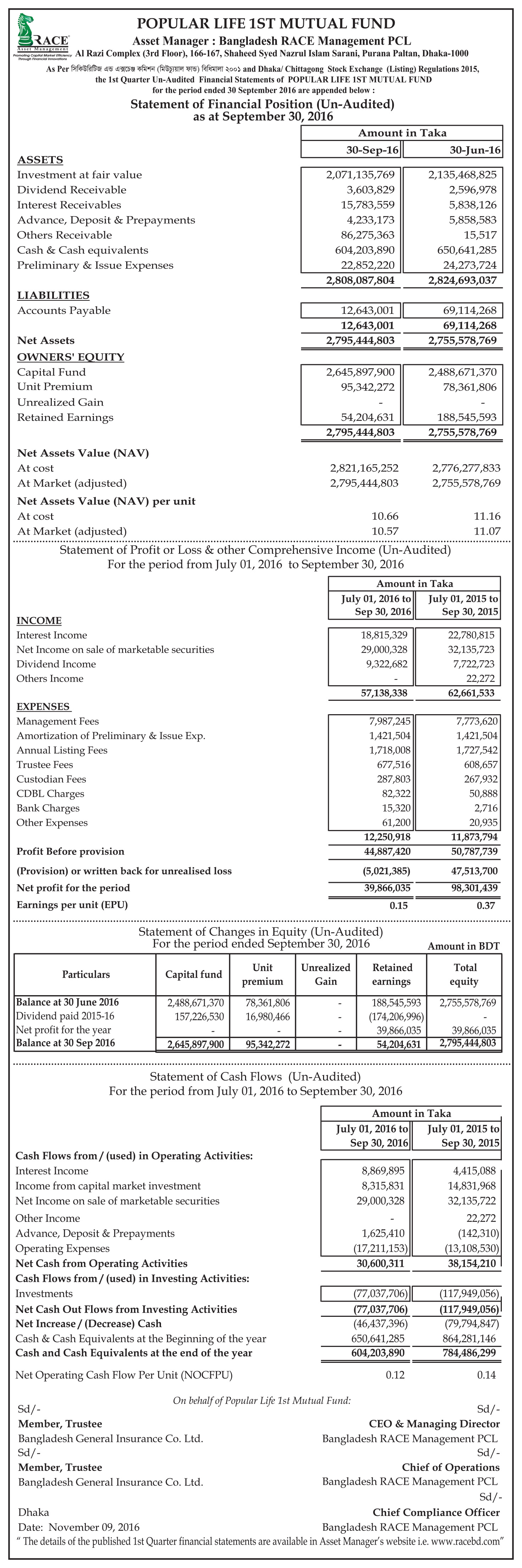 Un-audited Statements of Financial Position of Popular Life First Mutual Fund