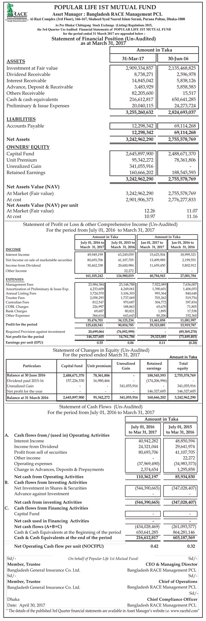 Un-audited Statements of Financial Position of Popular Life First Mutual Fund