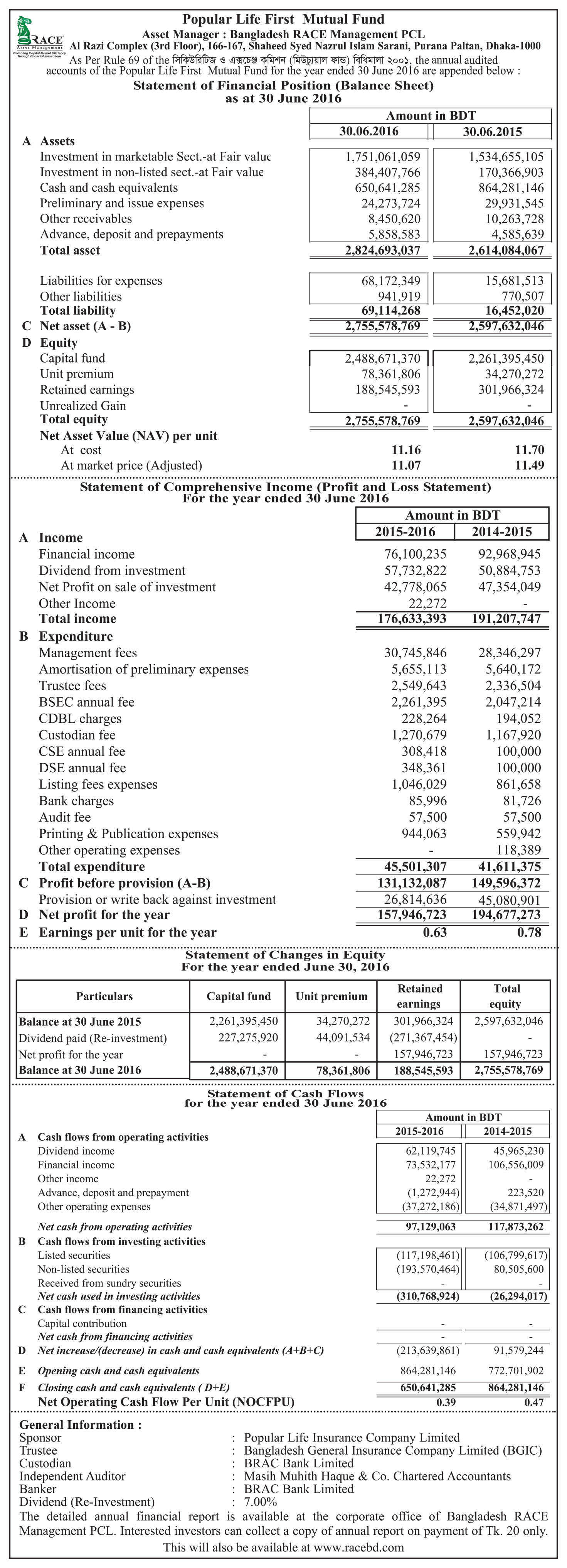 Un-audited Statements of Financial Position of Popular Life First Mutual Fund