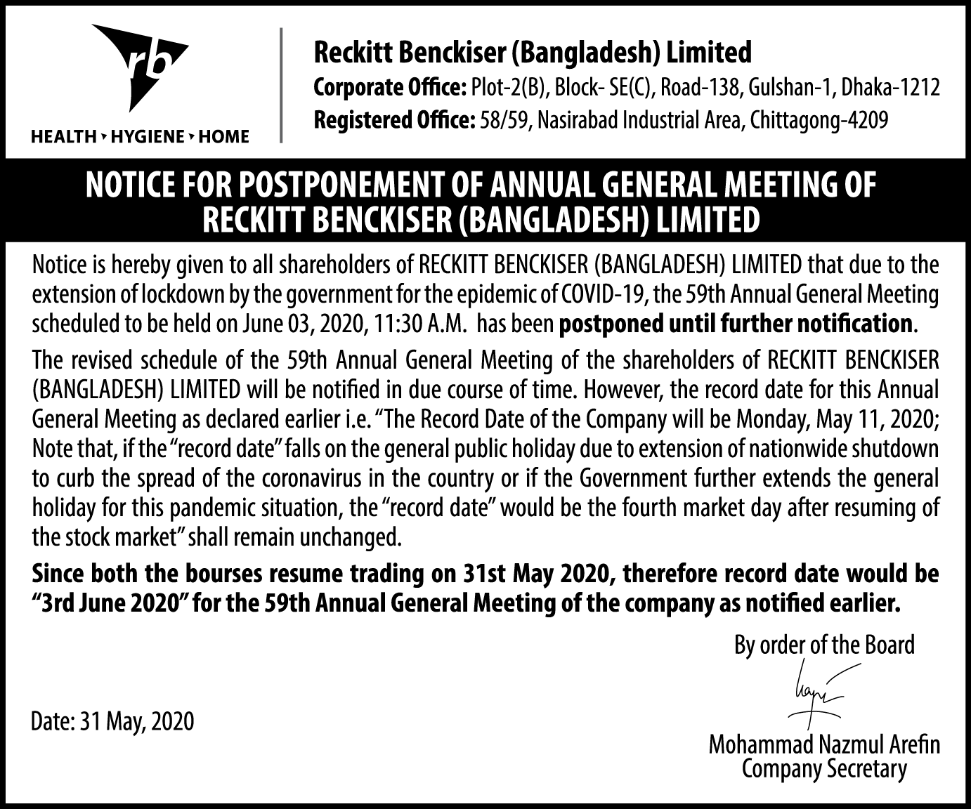 Postponement Notice of AGM of Reckitt Benckiser (Bangladesh) Ltd