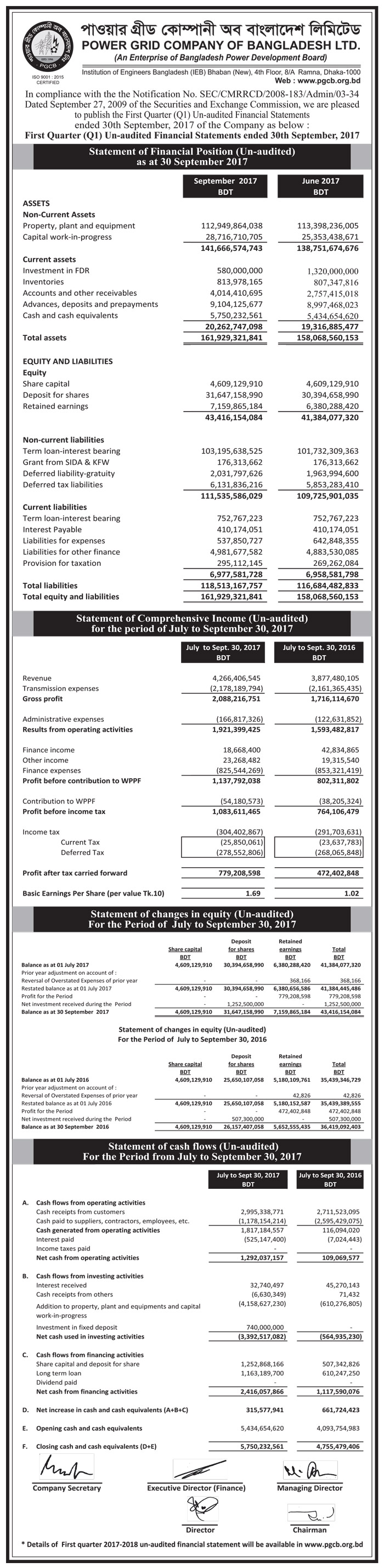 Q2 Un-audited Financial Statements of Power Grid Company of Bangladesh Ltd