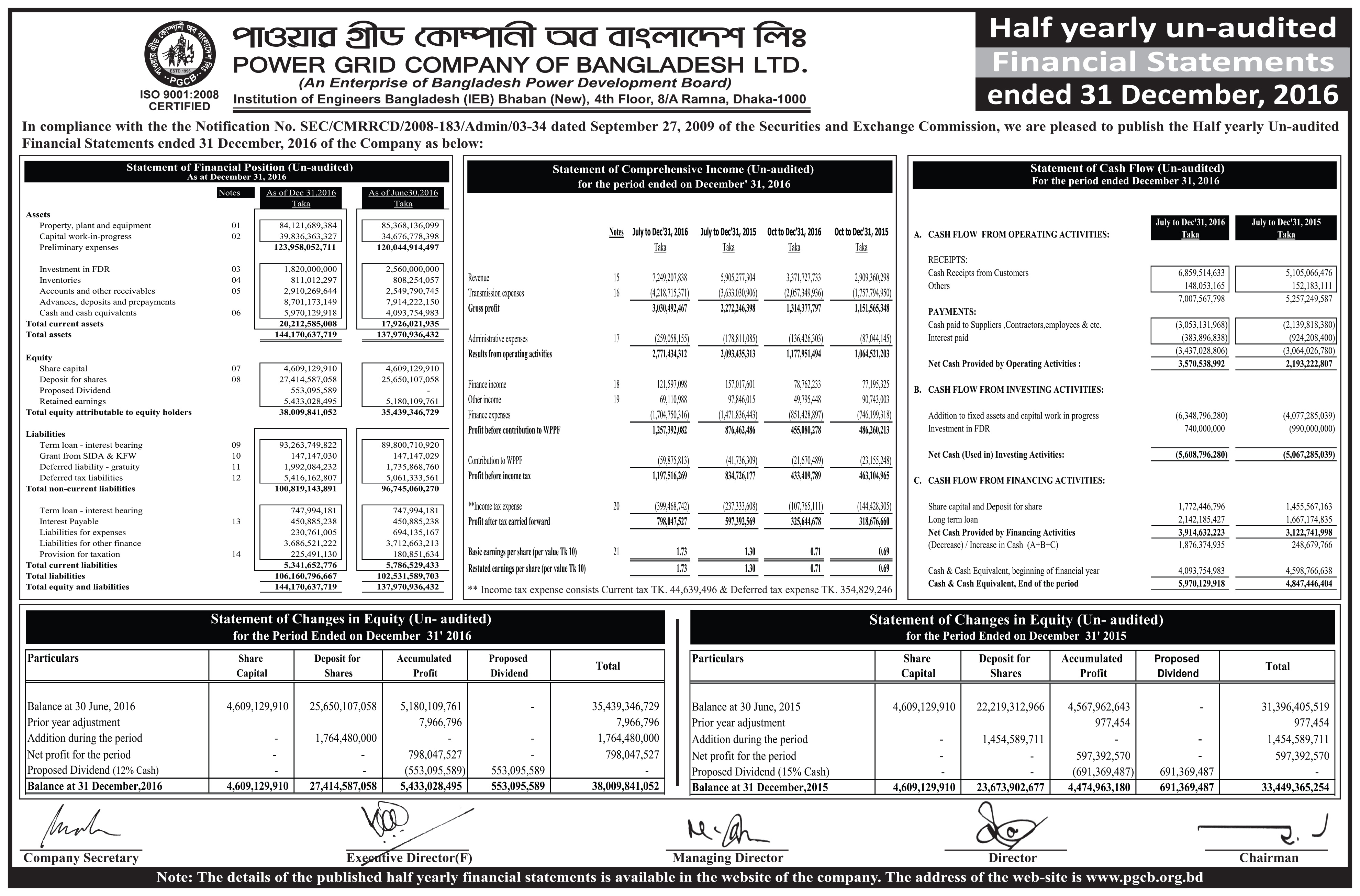 Q2 Un-audited Financial Statements of Power Grid Company of Bangladesh Ltd