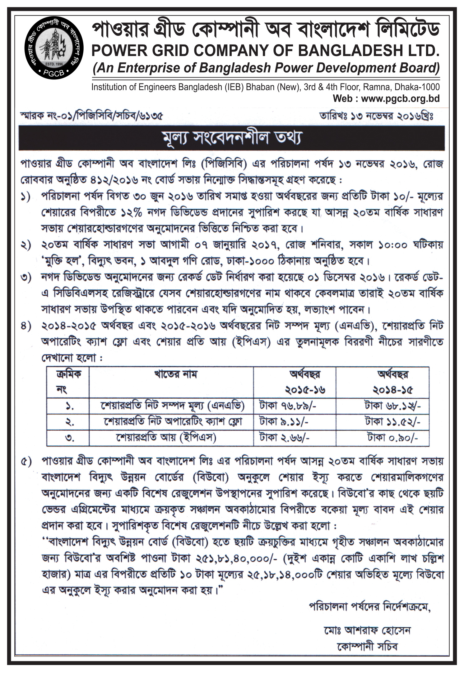 Price Sensitive Information of Power Grid Bangladesh PLC