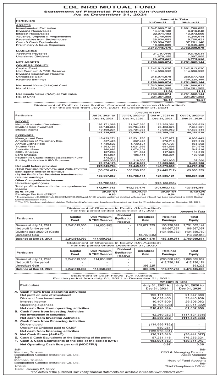 Un-audited Statements of Financial Position of EBL NRB Mutual Fund