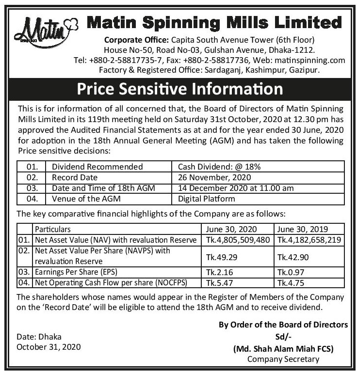 Price Sensitive Information of Matin Spinning Mills Ltd.