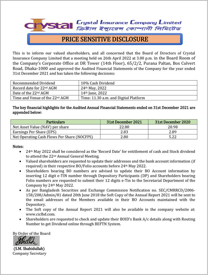 Price Sensitive Disclosure of Crystal Insurance Company Limited