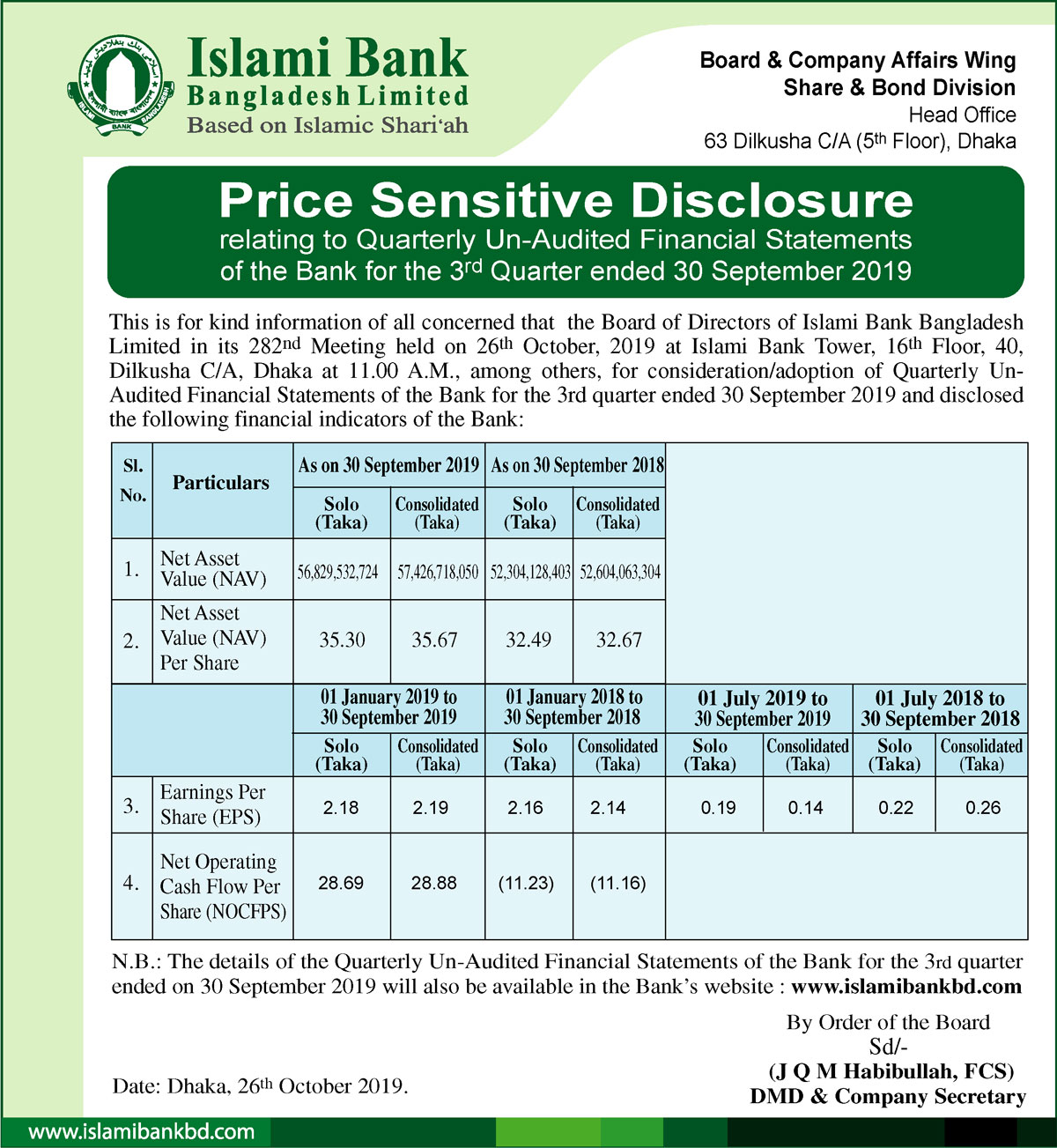 Price Sensitive Information of Islami Bank