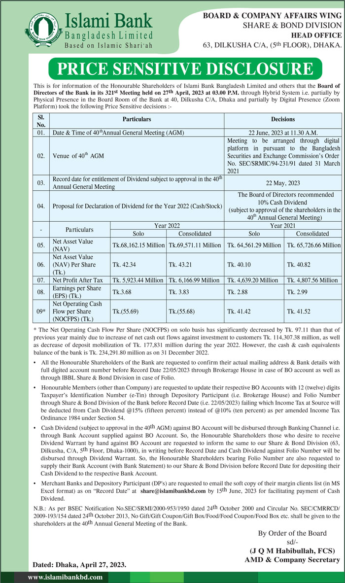 Price Sensitive Information of Islami Bank