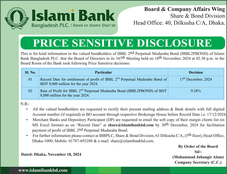 notice for record date for entitlement of Profit against IBBL 2nd Perpetual Mudaraba Bond