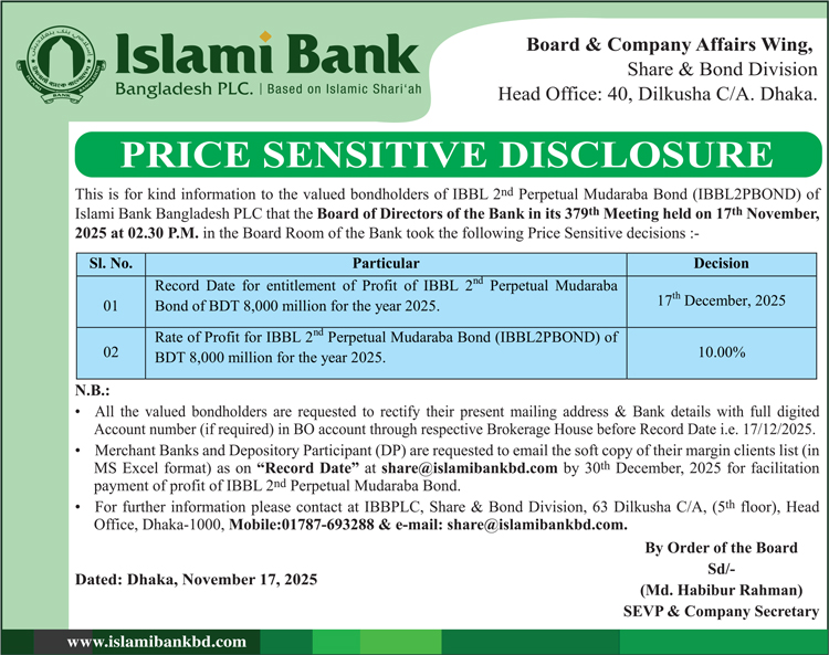 notice for record date for entitlement of Profit against IBBL 2nd Perpetual Mudaraba Bond