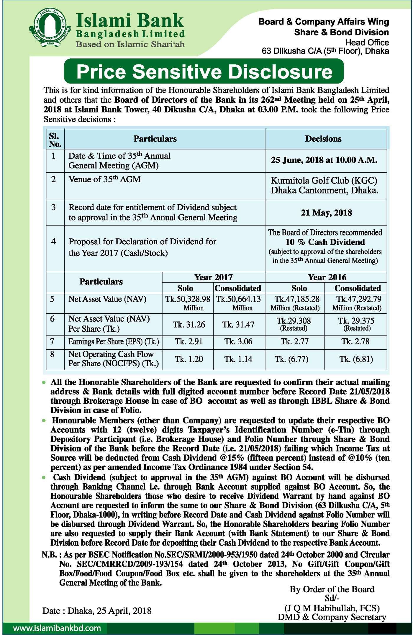 notice for record date for entitlement of Profit against IBBL 2nd Perpetual Mudaraba Bond