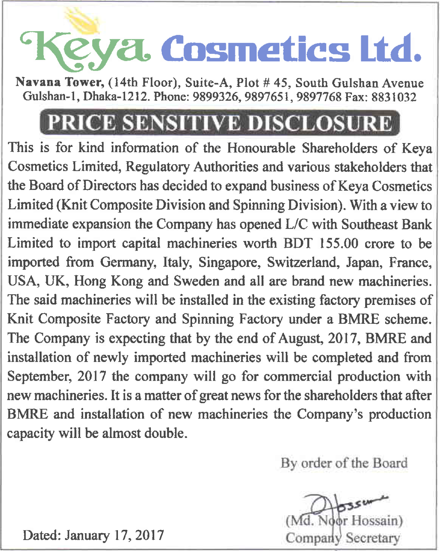 Price Sensitive Disclosure of Keya Cosmetics Ltd.