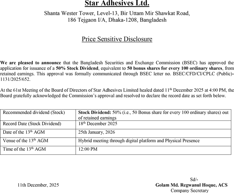 Price Sensitive Disclosure of Star Adhesives Ltd.