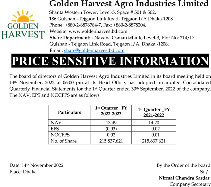 Price Sensitive Information of Golden Harvest Agro Industries Limited