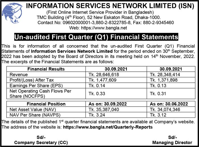 Un-audited Q1 Financial Statements of Information Services Network