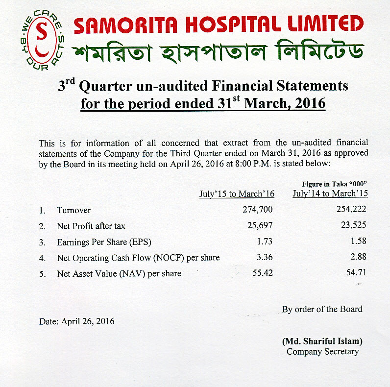 Samorita Hospital Limited Half Yearly Financial Statements (Un-audited)