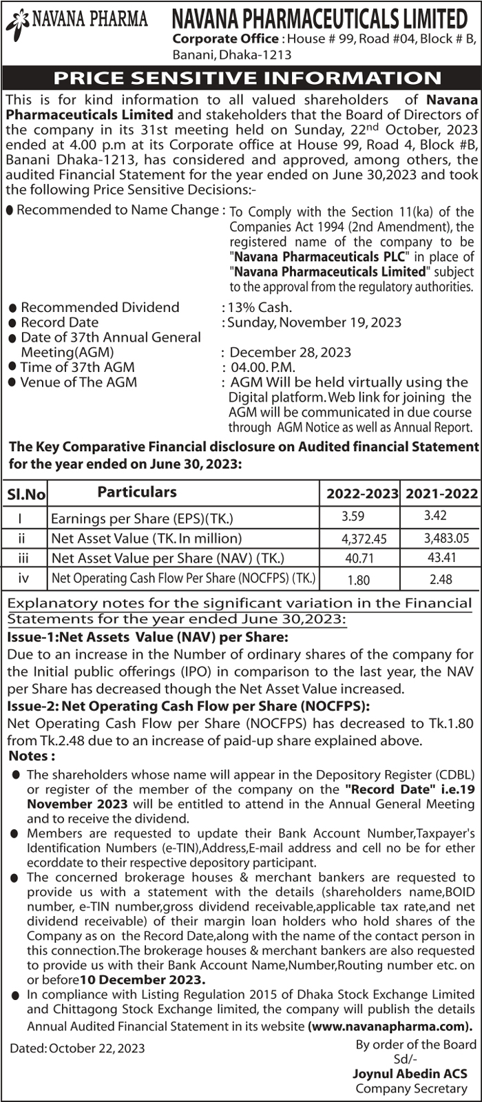 Price Sensitive Information of Navana Pharmaceuticals Ltd