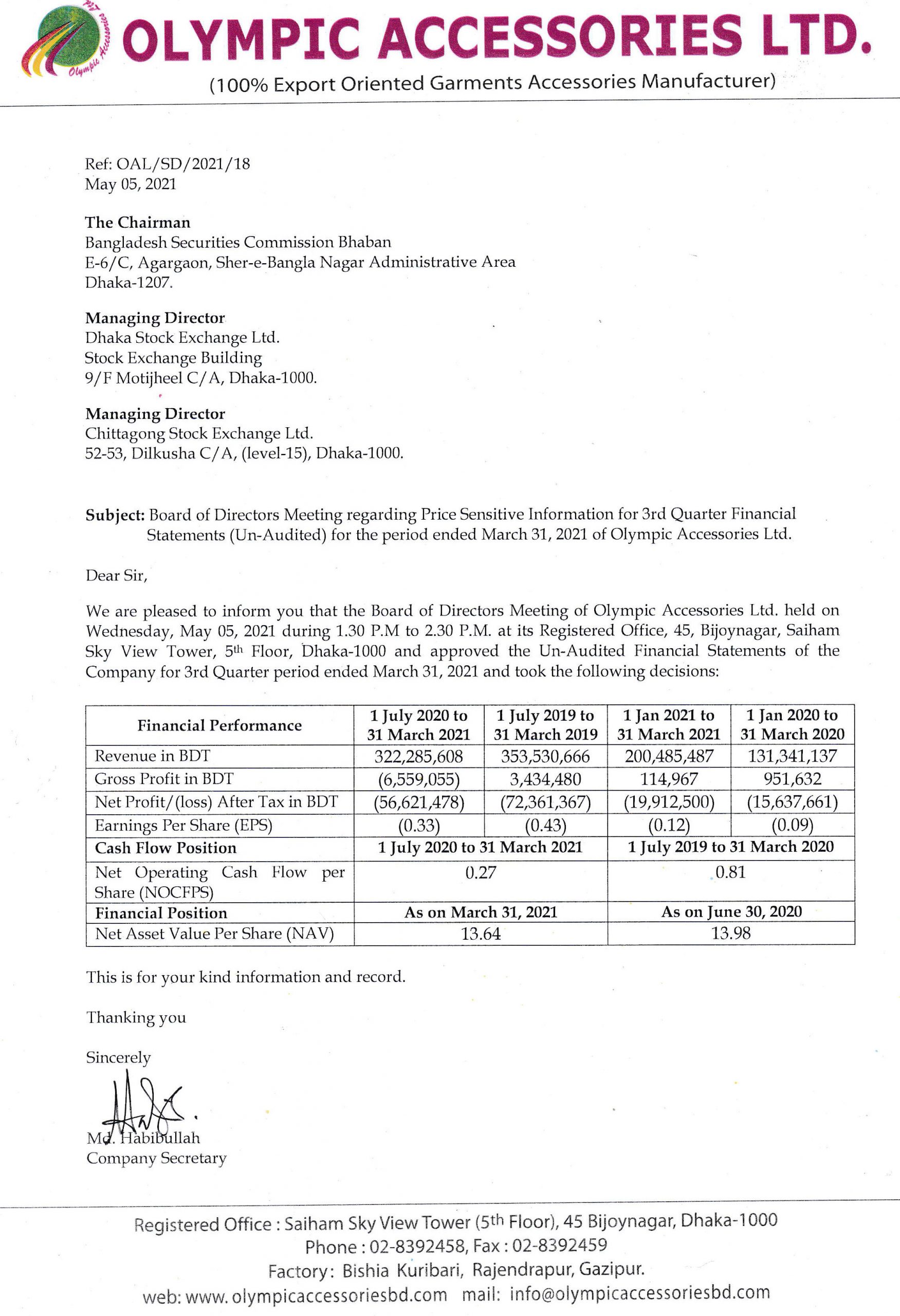 Price Sensitive Information (3Q) Of Olympic Accessories Limited